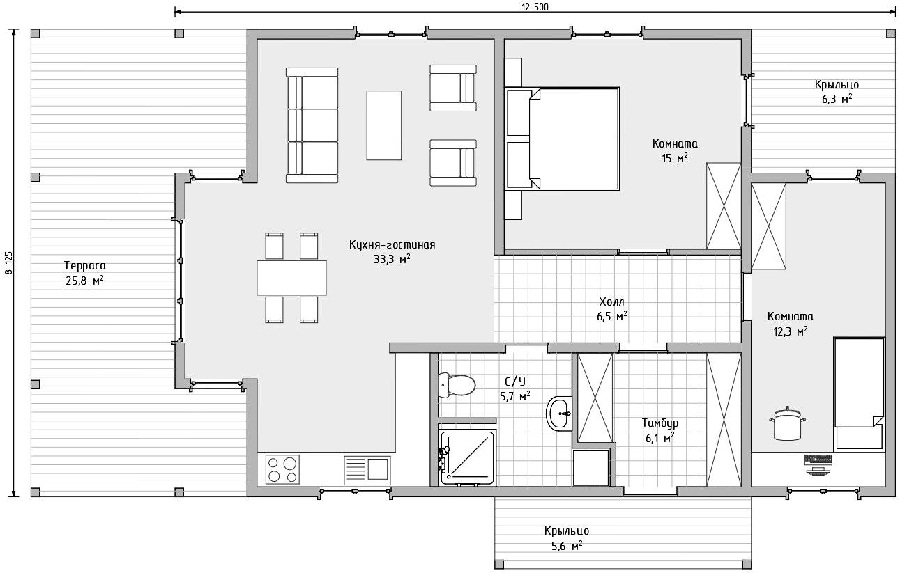 - Большая крытая терраса (рассчитывается индивидуально) - это больше чем просто площадка перед домом, это островок комфорта, вдохновения и уюта, созданный специально для вас .