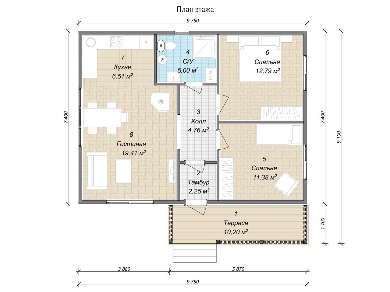 В доме максимально эффективно разместились: 2 спальни, 1 санузел, просторная кухня-гостиная.